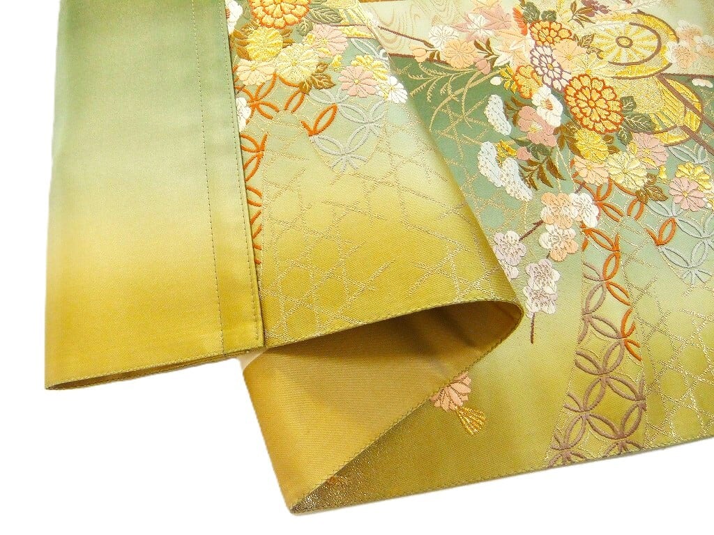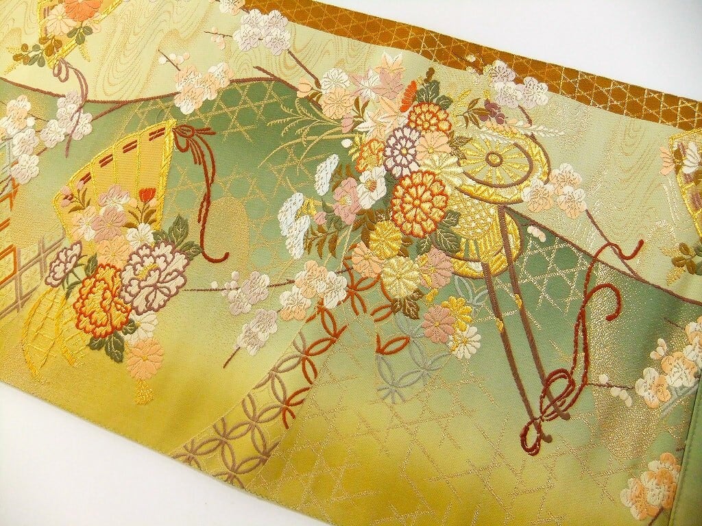■新品の帯をリメイクしました。緑系ボカシ地に檜扇花車文様で上品で高級感がございます。
