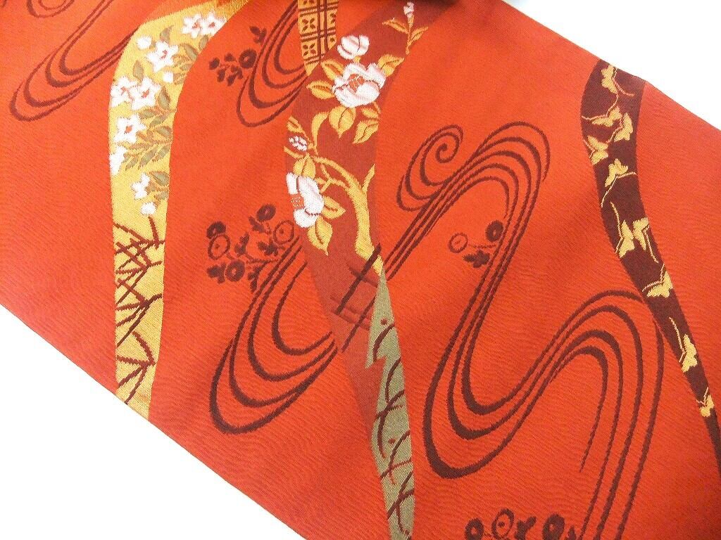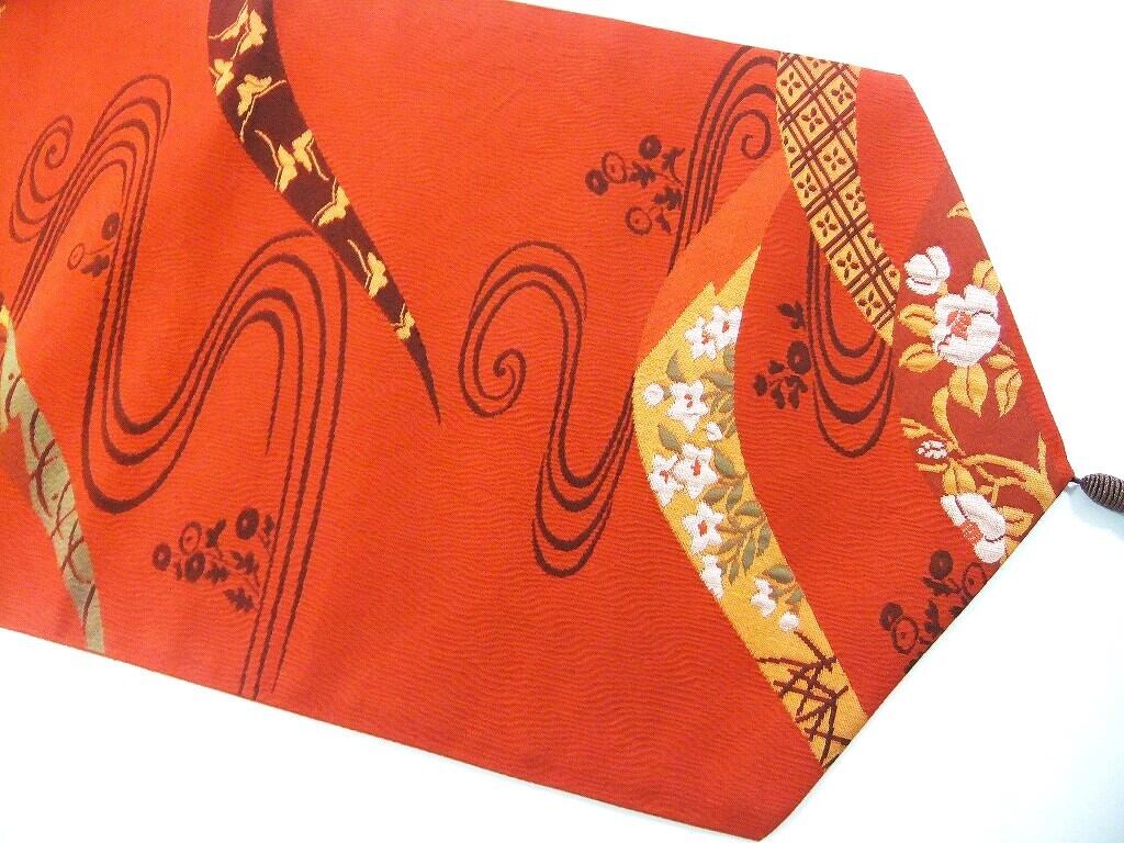 新品の帯をリメイクしました。赤茶地に流水草花文様です。贈り物にも最適です。