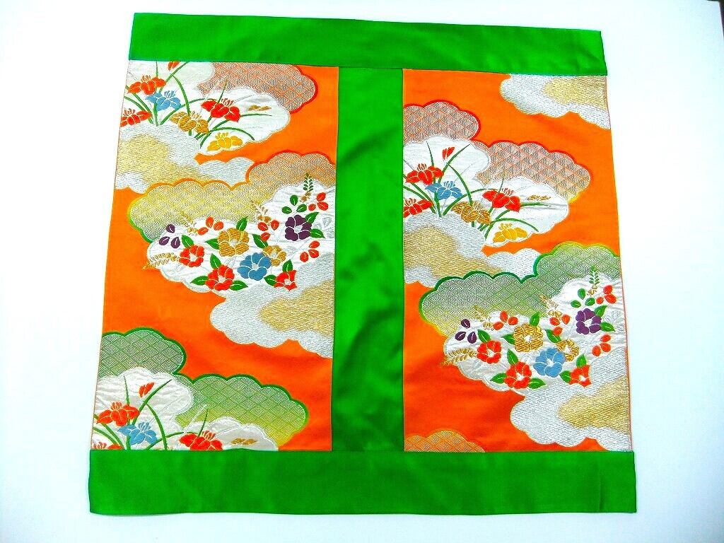 ■帯を繋いでリメイクいたしました。少し使用感のある帯地ですが色鮮やかで豪華さがあるマットです。