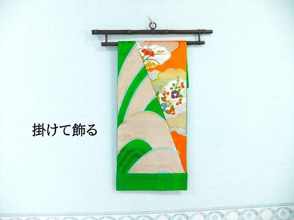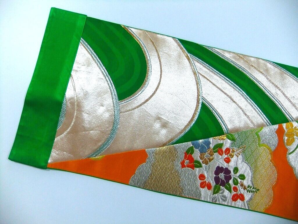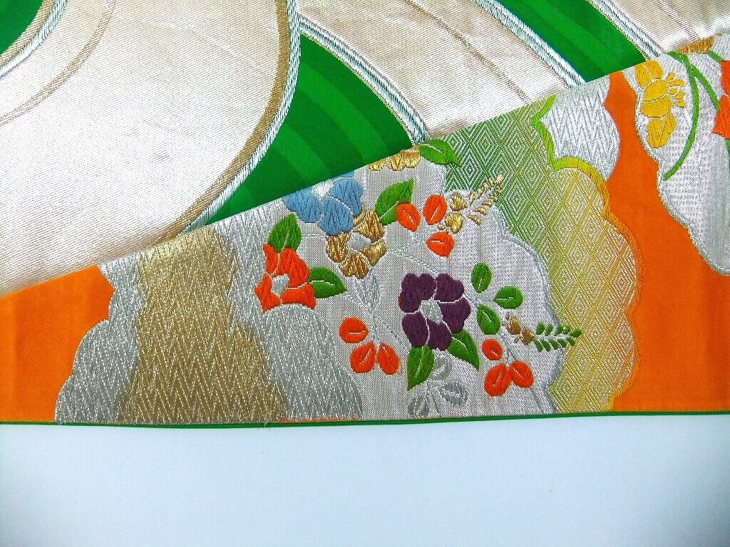 緑系とオレンジ系の色鮮やかな帯地で高級感と華やかさがございます。無地部分は中無地(絹)を使用しています。