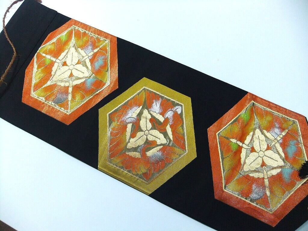 黒地に亀甲花文様です。落ち着いた文様でどんな場面にも栄える色合いです。下にタッセルを付けました。
