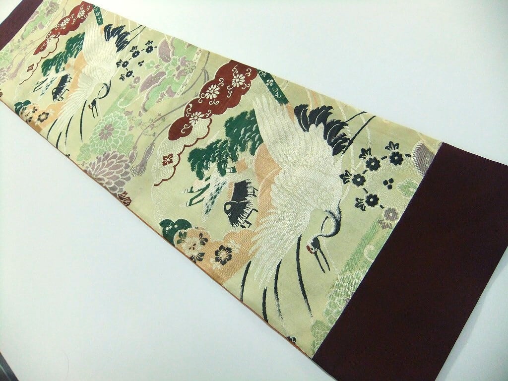 ■100年前の帯としては状態が良いです。薄汚れ感が多少感じられますが目立つ染みダメージはございません。古さ加減を楽しみたい方に良いかと思います。キナリ地に鶴や菊、冠のような文様の吉祥文です。