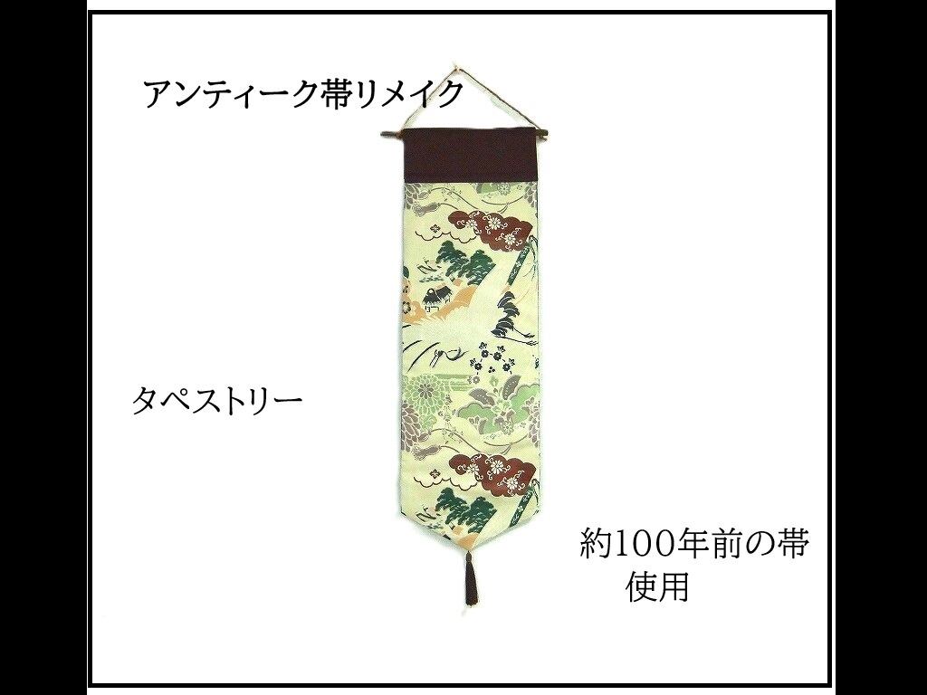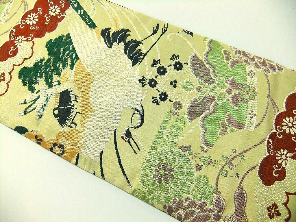 ■100年前の帯としては状態が良いです。薄汚れ感が多少感じられますが目立つ染みダメージはございません。古さ加減を楽しみたい方に良いかと思います。キナリ地に鶴や菊、冠のような文様の吉祥文です。上部分、裏地は他の帯中無地(絹)を使用しタッセルを付けました。