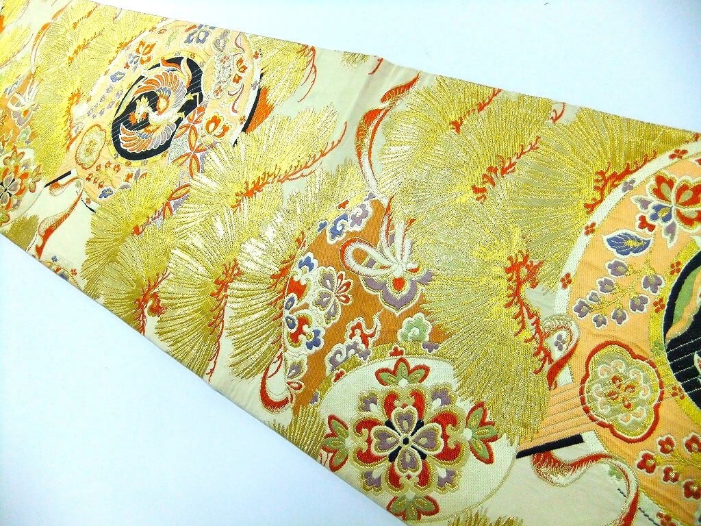 ■100年前の帯としては状態が良いです。薄汚れ感が多少感じられますが目立つ染みダメージはございません。古さ加減を楽しみたい方に良いかと思います。キナリ地に鳳凰や笠松文様の吉祥文です。金糸の笠松が華やかです。