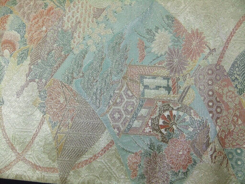 帯としての使用感は殆どなく美品で贈り物にも最適です。銀糸地に淡い色合いの鳥や御所車、花の吉祥文様です。